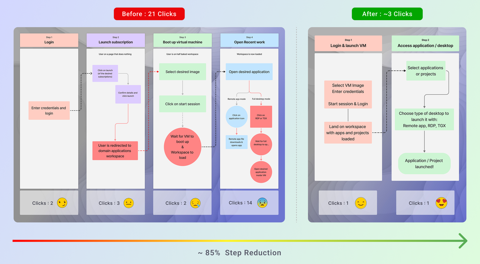 Before: Users navigated through Login → Launch Subscription → Boot Virtual Machine → Open Recent Work — accumulating 21 clicks, multiple redirects, and significant wait time before starting actual work.