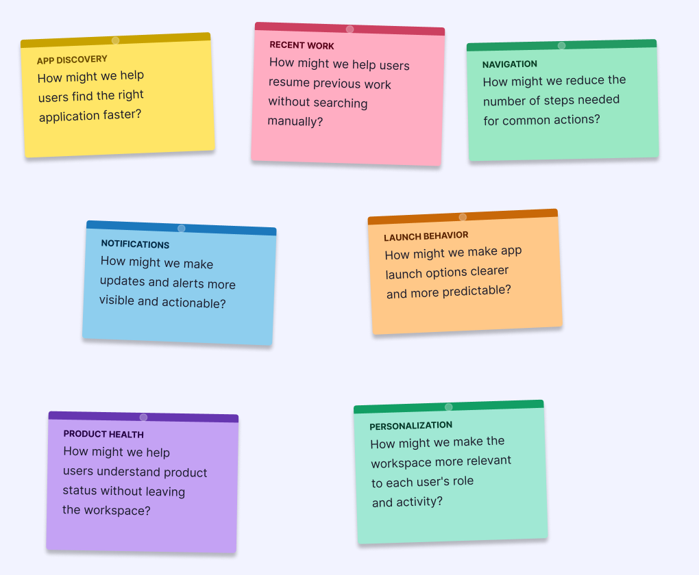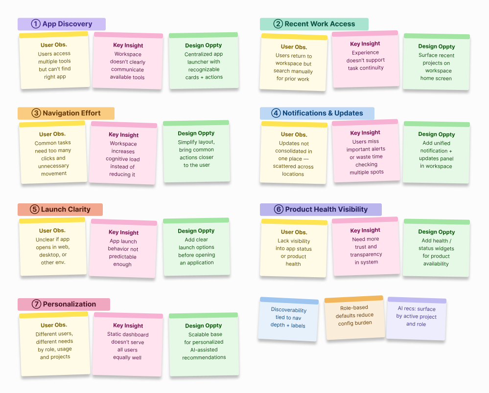 I audited the existing workspace experience across navigation, app access, recent work visibility, system feedback, and user confidence. The audit surfaced five critical failure points — not aesthetic issues, but structural problems in how the workspace communicated and responded to users.
