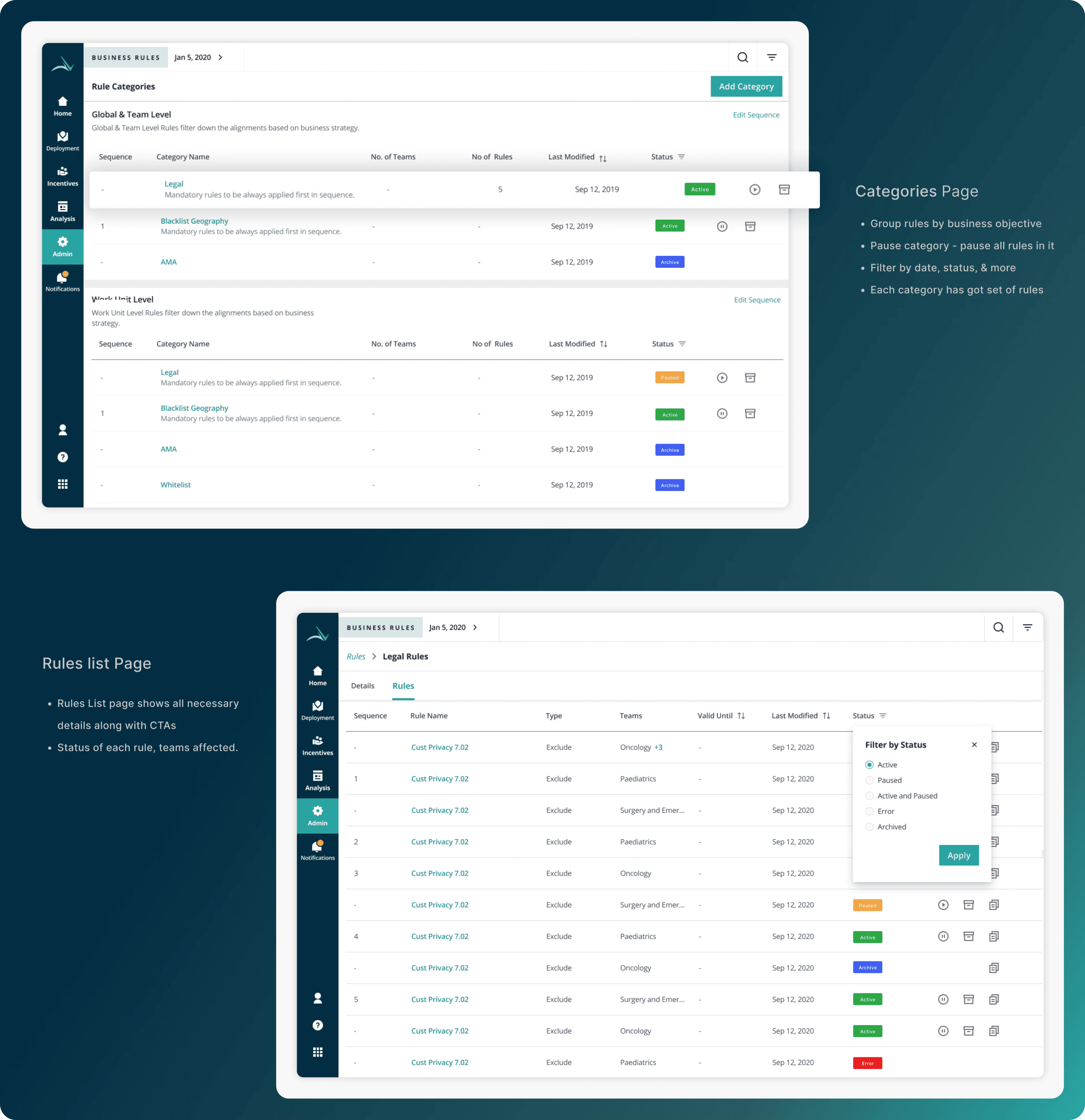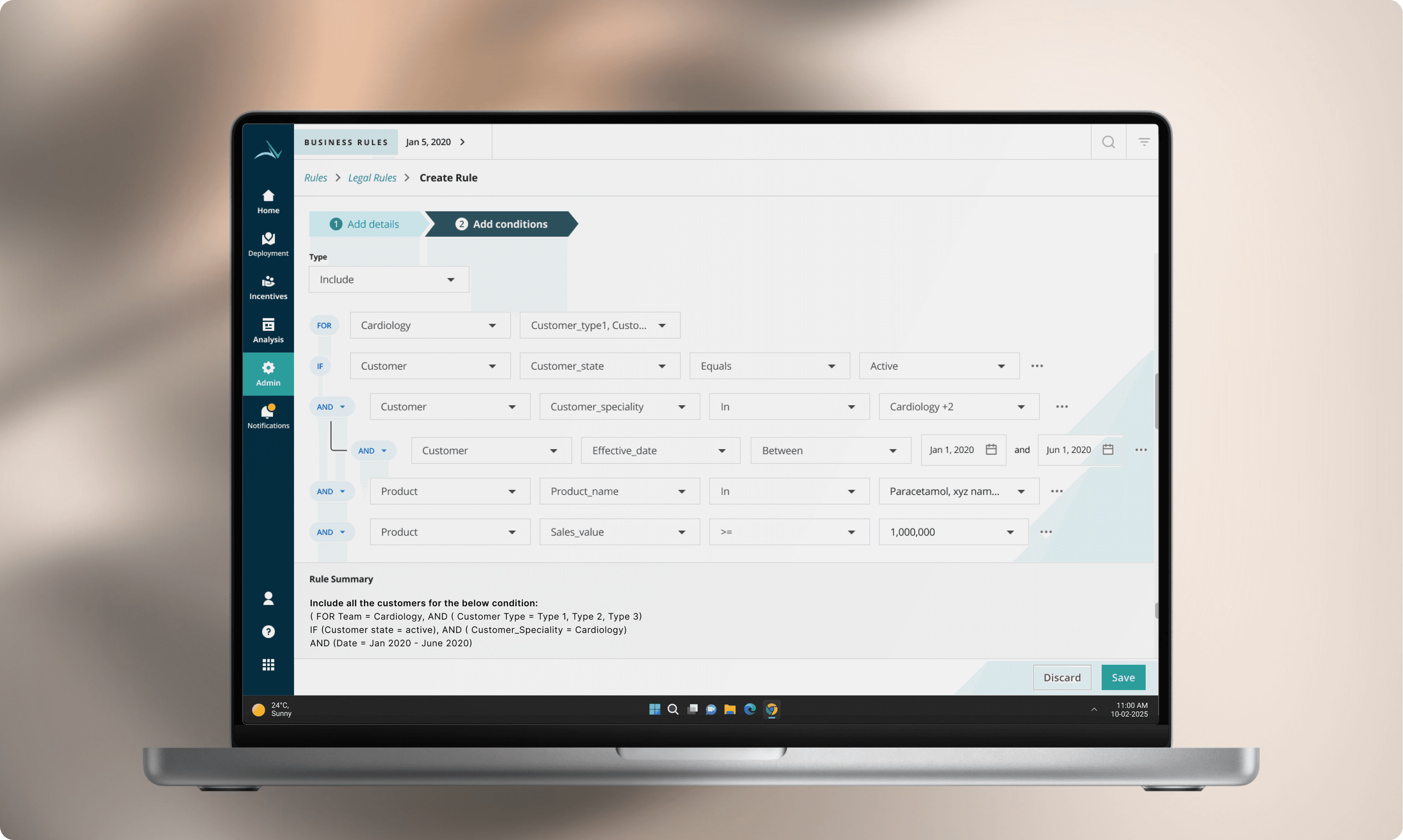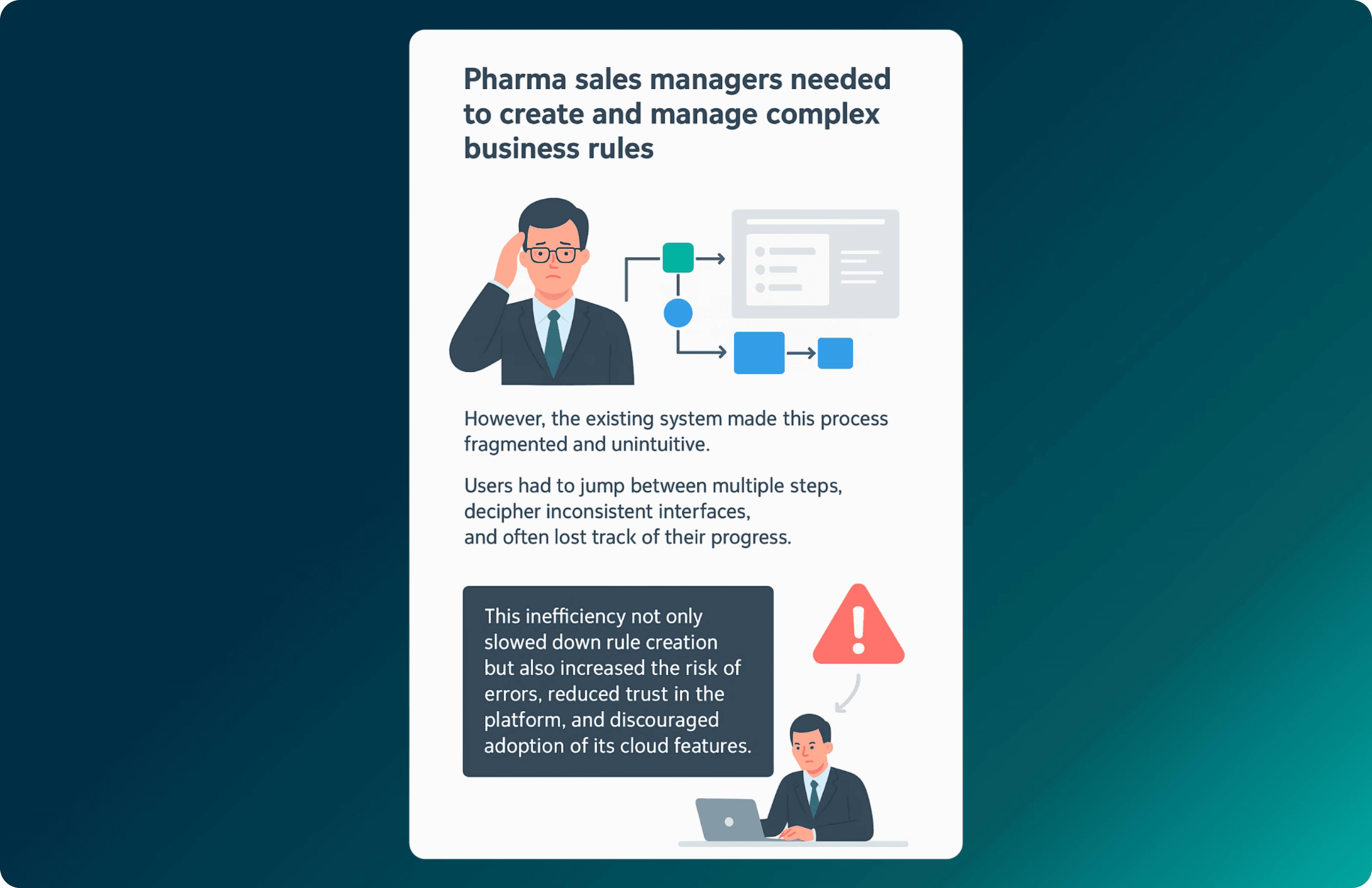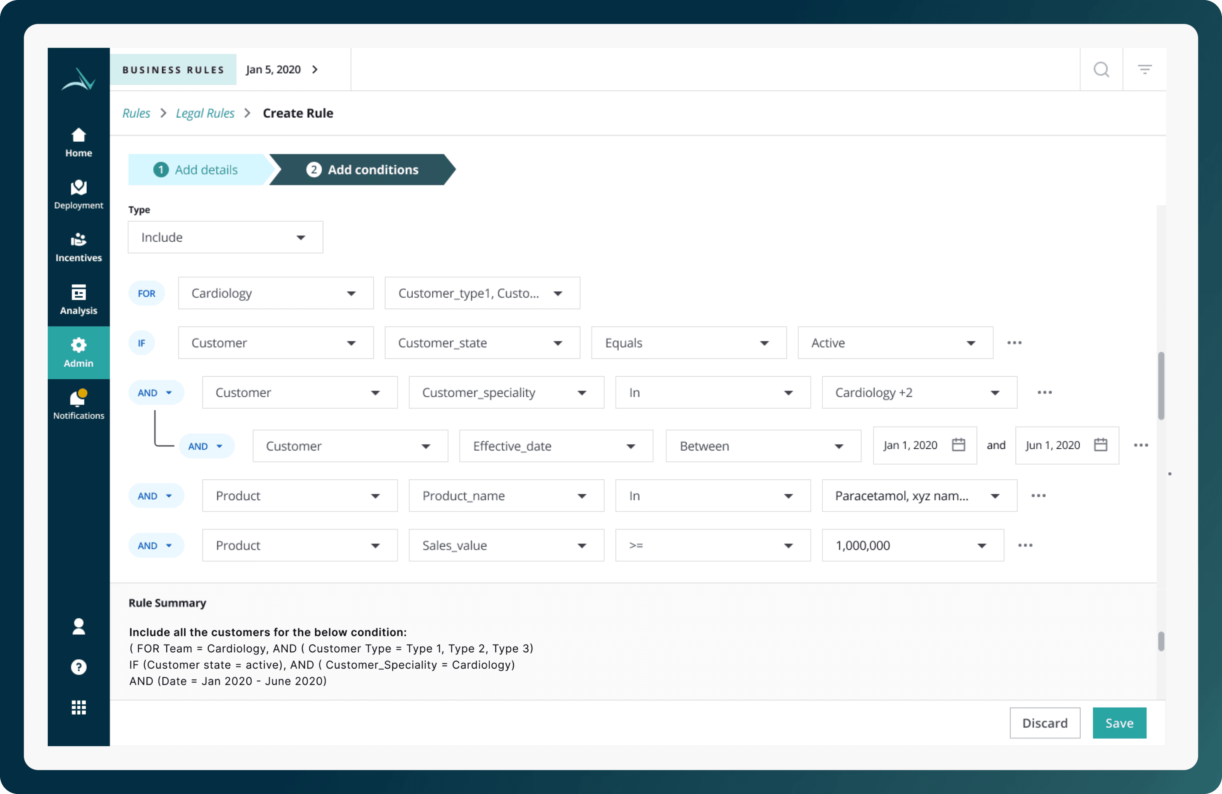 Users: Pharma Sales Managers (rule creators), with downstream impact on Sales Reps.