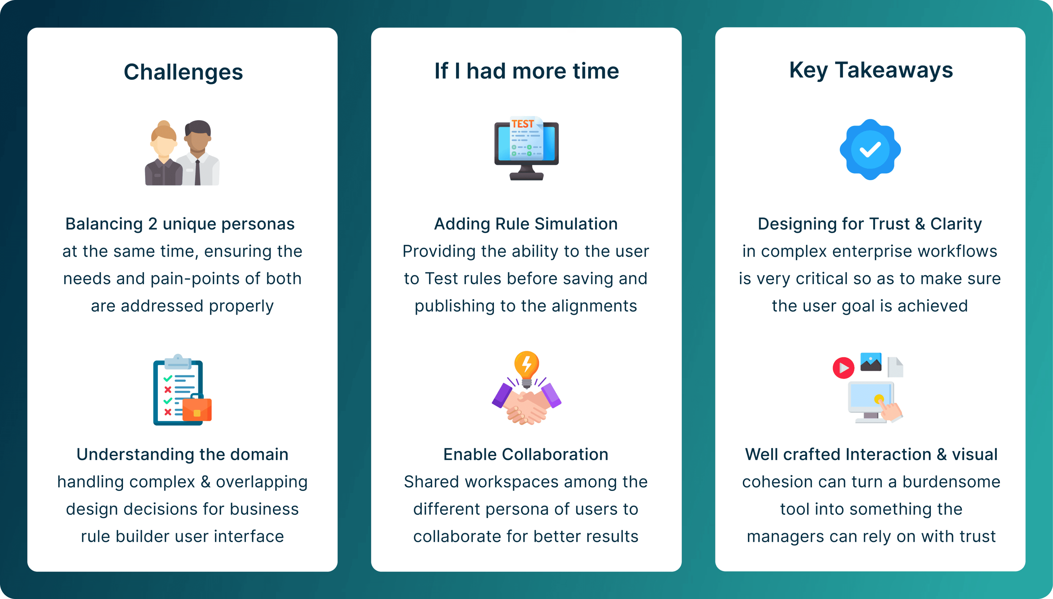 Modern look and feel, Intuitive UI, Capable of handling complex and nested rules, Rule summary at bottom